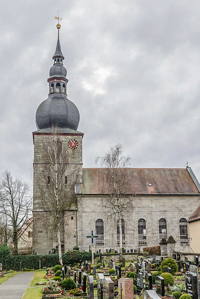 Mittelalterliche Chorturmanlage, Sandsteinquaderbau mit Satteldach und massiven Rechteckturm mit Zwiebelhaube, Turmunterbau 14./15. Jahrhundert, Turmobergeschoss 1715–17, Langhaus 1835/36, über älterem Kern.