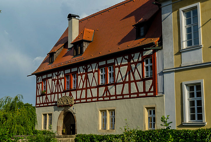 ....der "Nordflügel" des Alten Schlosses von 1611. Erhalten geblieben ist: das Fachwerk-Obergeschoss, die Schlossbrücke sowie die Tordurchfahrt, an der das Wappen der Herren von "Crailheim" und Dölzkau angebracht ist....