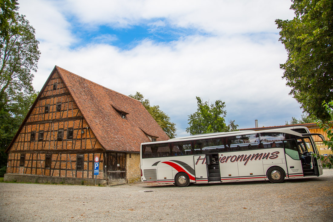 Hier auf dem Busparkplatz auf Schloss Langenburg steht unser Bus abfahrbereit nach Unterregenbach....