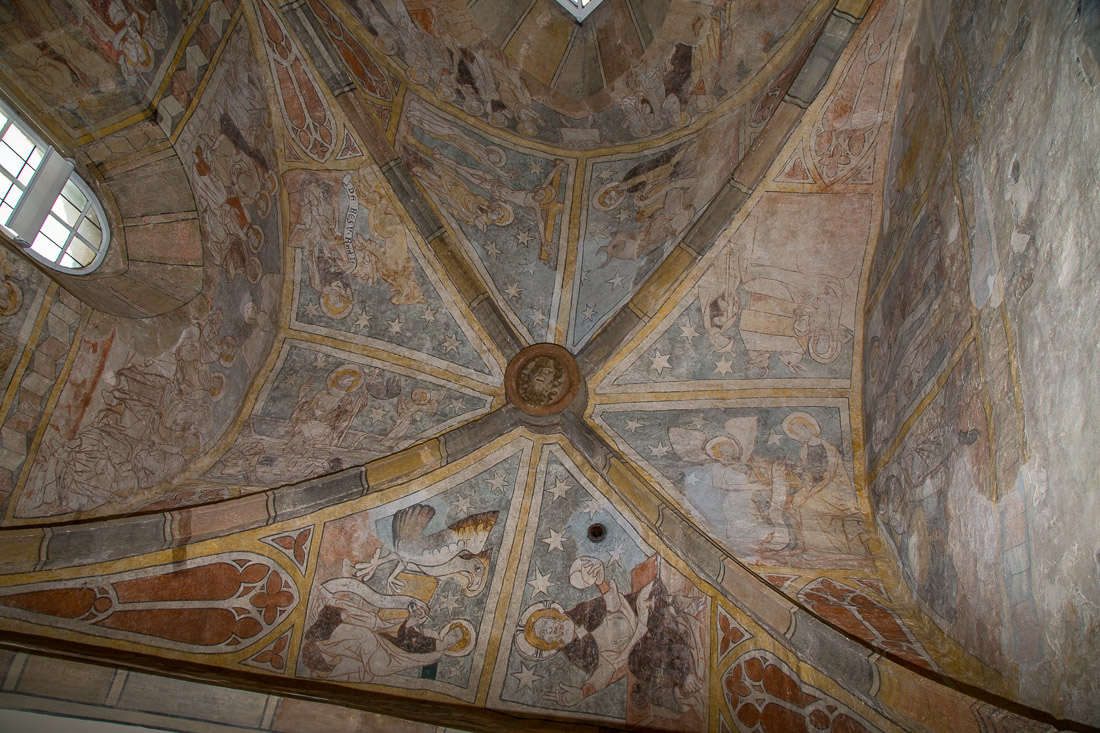 ....Im Turmchor mit Rippenkreuzgewölbe, gelten die Fresken als wertvolle Kleinode fränkischer Kunst. Um den Schlussstein mit dem abgeschlagenen Kopf des Heiligen Johannes der Täufer in der Johannisschüssel gruppieren sich die Symbole der vier Evangelisten Matthäus, Markus, Lukas und Johannes.