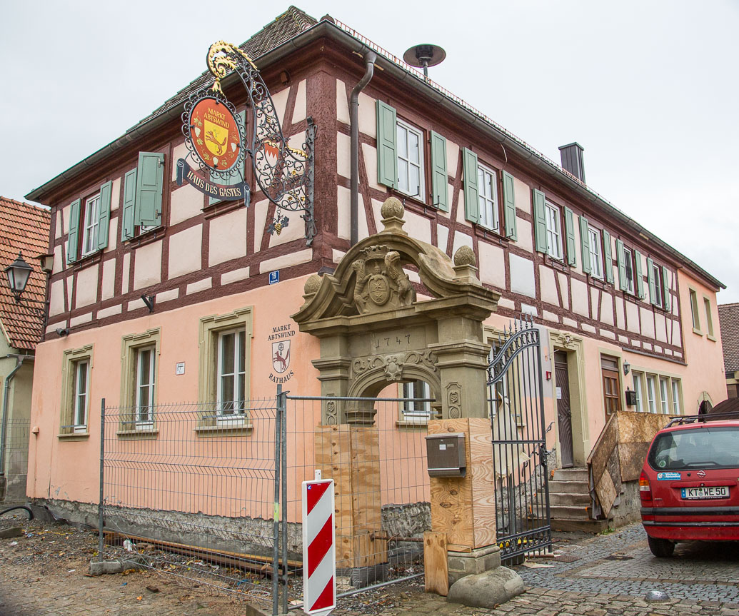 Rathaus (zweite Hälfte 18. Jahrhundert) mit dekorativen Hofportal (1747).