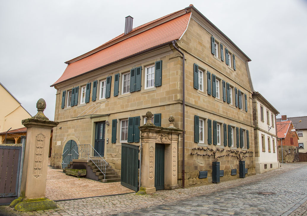 Zweigeschossiger giebelständiger Sandsteinquaderbau mit Mansardhalbwalmdach (1822)