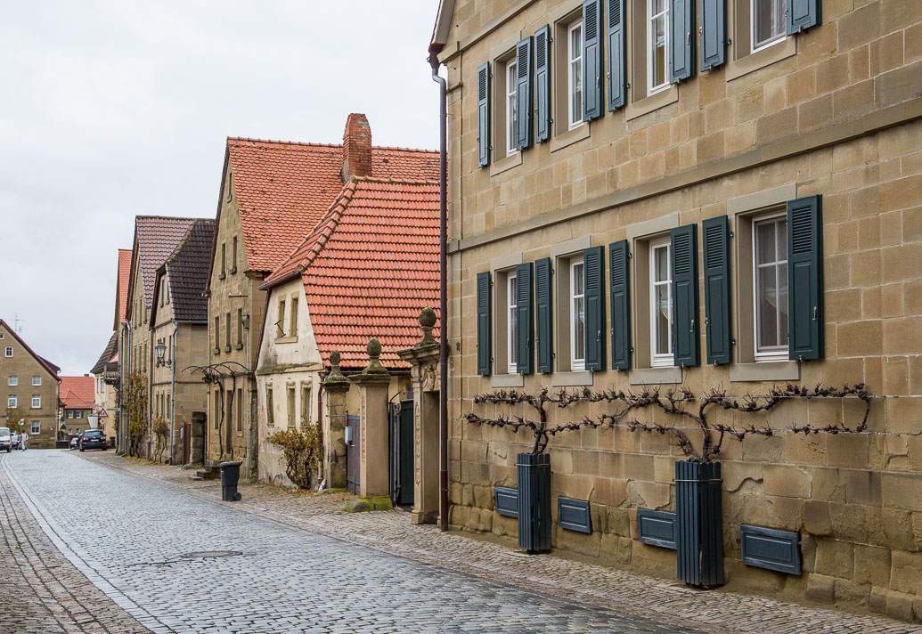 Ortskern entlang der Hauptstraße mit prachtvollen Sandsteinhäusern. Das Bild der Straße wird geprägt von giebelständigen, zweigeschossigen Winzer- und Bauernhöfen des 18. und 19. Jahrhunderts.