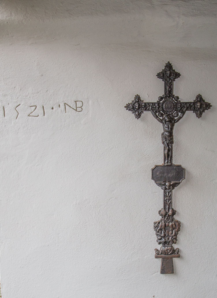 Gußeisernes Kreuz vor dem Hauptportal zur Kirche. Man beachte, Jesus am Kreuz mit vier (!) Nägeln....