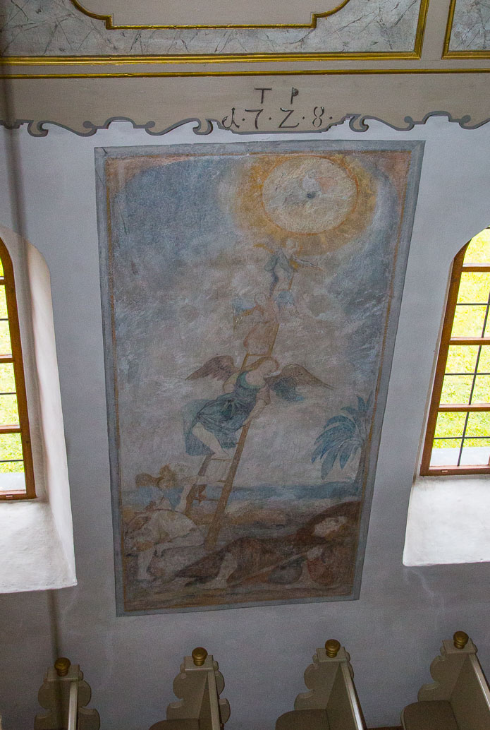 Blick von der Orgelempore auf das gotische Fresko im Kirchenschiff, das den Traum Jakobs von der Himmelaleiter darstellt.